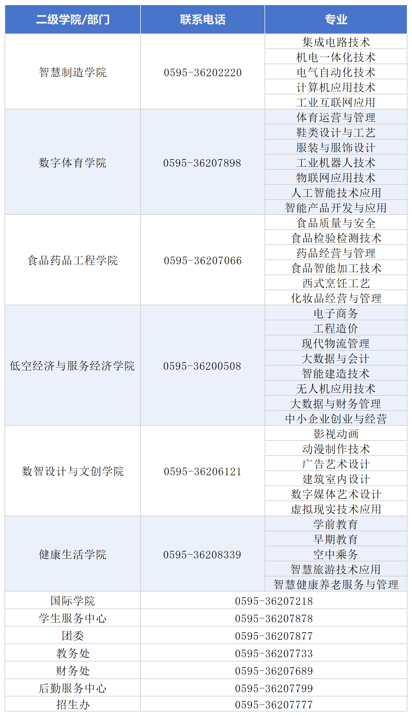泉州轻工职业学院各二级学院和相关部门联系方式